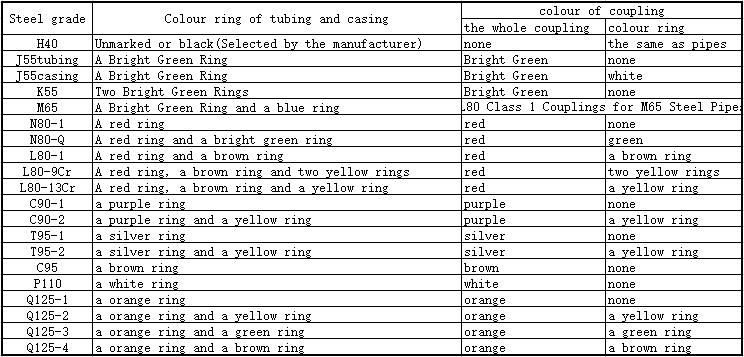 Tubing, casing and coupling should be sprayed with color code to distinguish different grades of steel. The color code of tubing pipe and casing pipe is to spray the color ring at the distance of more than 600 mm from any end. The coupling is sprayed with color on the whole outer surface, and then the color ring is sprayed.